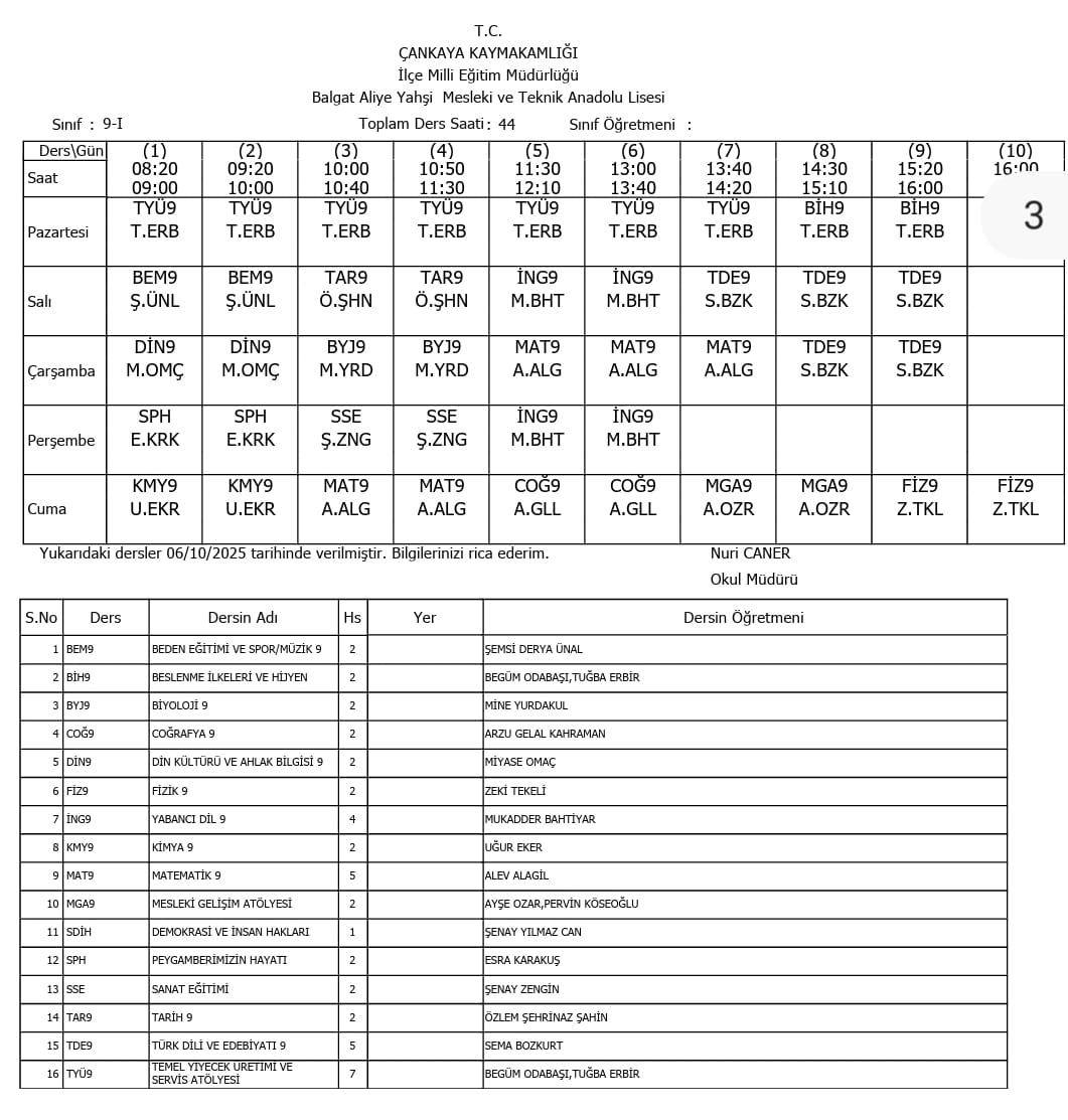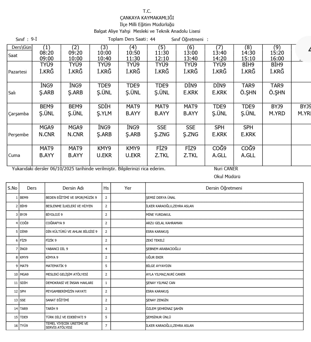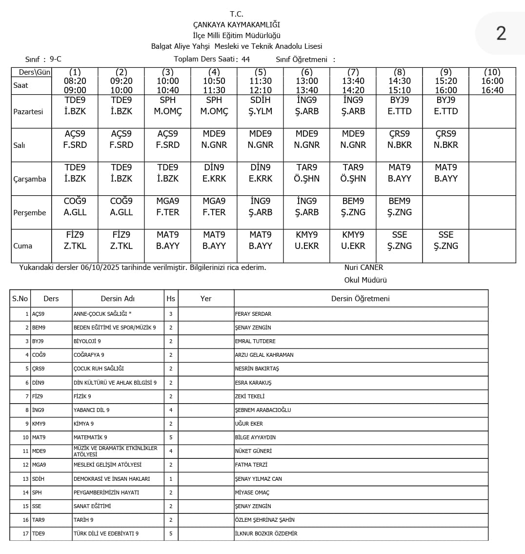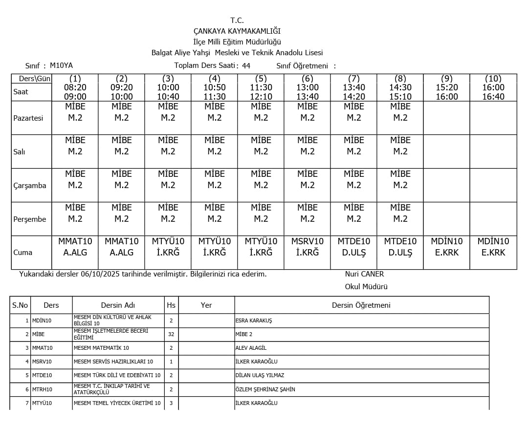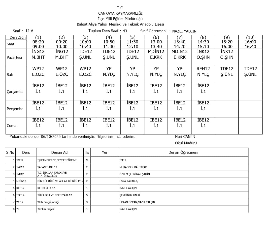 2025 - 2026 Eğitim Öğretim Yılı 6 Ekim 2025 Pazartesi Tarihinden İtibaren Geçerli Şubelerimize Ait Ders Programları: